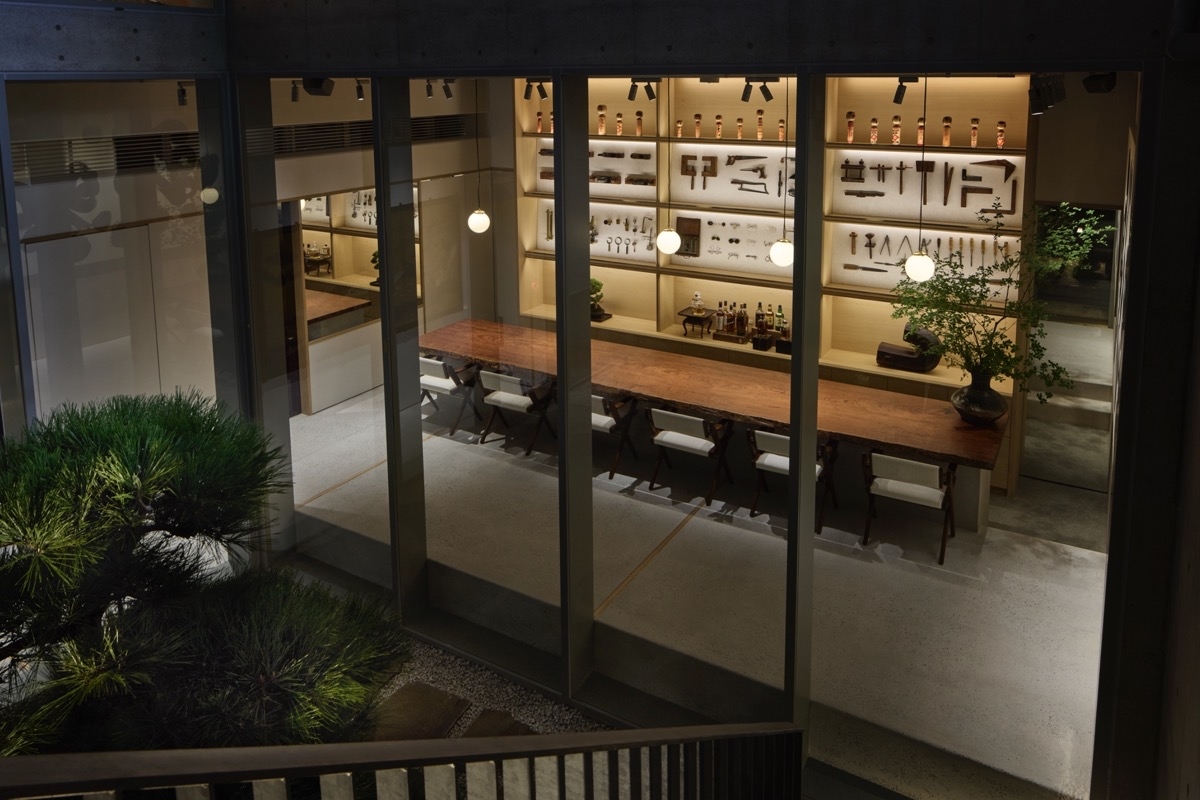 地下階には、もみじの木と枯山水の庭が設えられた静謐なスペースが広がり、17世紀ヨーロッパの光学機器が並ぶ壁に囲まれた特注のバーで、日本のウイスキーやSIMPLICITY監修による和菓子とお茶がもてなされる。