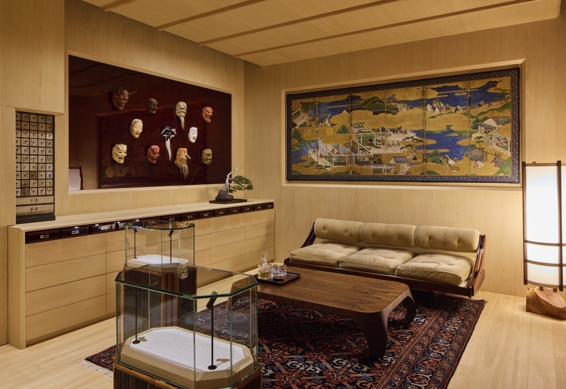 「マザーシップ」をイメージしたギャラリーのエントランスは、神聖な素材である檜で仕上げられた空間が広がり、2階へと進むと、静けさを感じさせるテラスを抜けて、ジュエリーおよびカスタム専用スペースへ。能面のコレクションや六曲屏風が設えられたバーで、ウイスキーを片手にゆったりと寛ぐことができる。