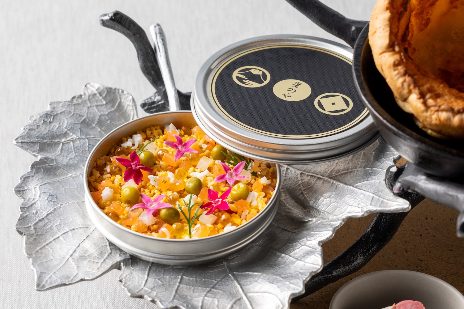 コースの幕開けを飾るのは、華やかな前菜「大鱒とウドのタルタル ミモザ仕立て」。大鱒のタルタルを、オーブンで焼き上げたダッチベイビーとともに味わうもので、ディナーへの期待感を高める一皿だ。