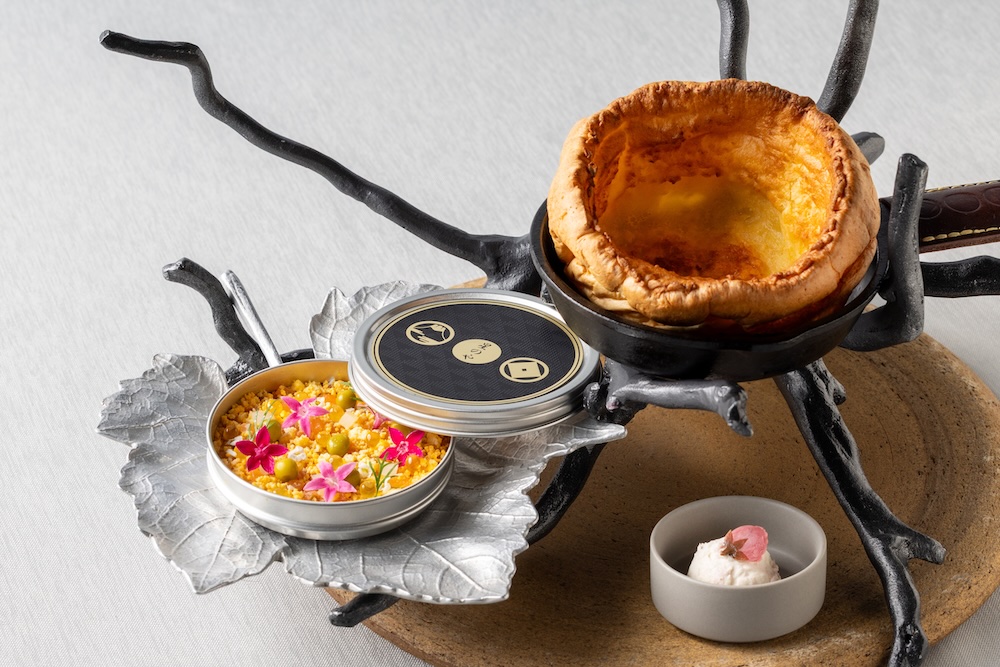 コースの幕開けを飾るのは、華やかな前菜「大鱒とウドのタルタル ミモザ仕立て」。大鱒のタルタルを、オーブンで焼き上げたダッチベイビーとともに味わうもので、ディナーへの期待感を高める一皿だ。