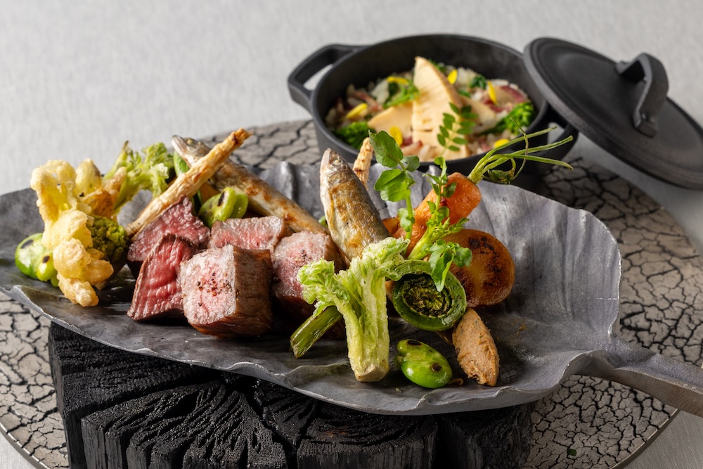 メインディッシュは「牛肉と鹿肉の炭火焼き 筍と菜の花のココットご飯」。炭火で焼き上げた牛肉や鹿肉の奥深い旨みと、今が旬の菜の花や山菜の繊細なほろ苦さを味わうことができる。