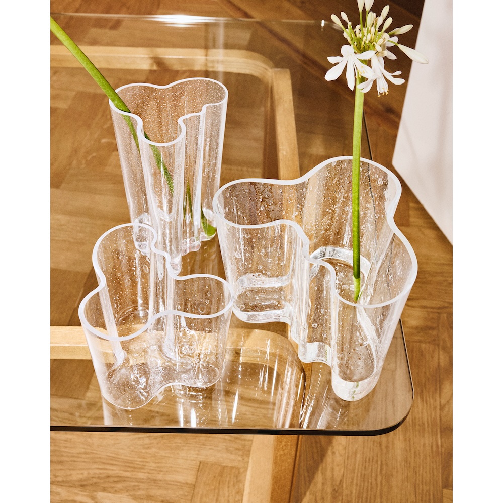 3月に登場した「Aalto Bubble Vase」は、“ガラスそのものに命を吹き込む新たな姿”を表現したコレクション。溶けたガラスにソーダを施すことで生まれる繊細な気泡を内部に閉じ込め、異なる表情を持つ一点物だ。オリジナルデザインの彫刻的な美しさに、光を受けてきらめくバブルの揺らぎが重なり、アアルトベースの新たな魅力を引き出している。