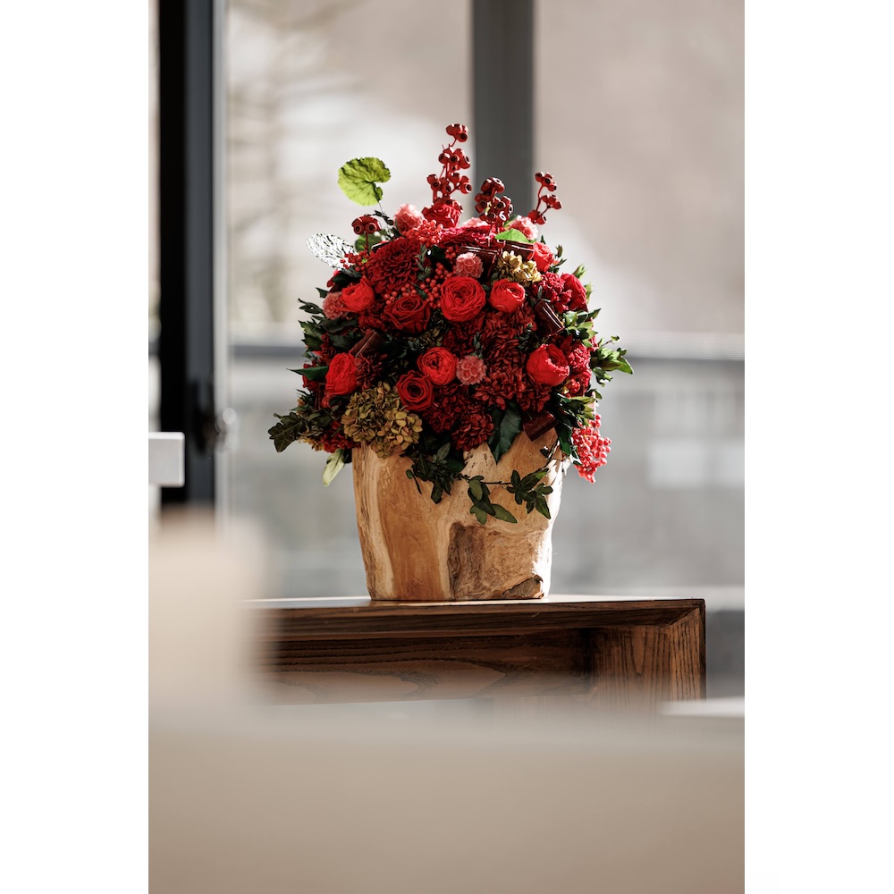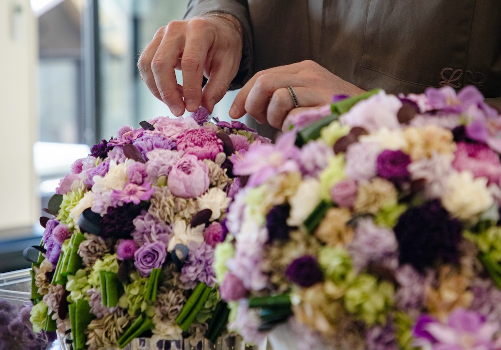 ベースカラーには、モノトーンを基調としたインテリアに映える紫を採用。そこに、力強い枝物や温もりある木の器、さらにオリジナルの有田焼の器を組み合わせることで、花と器、そして空間が一体となる表現を追求したという。