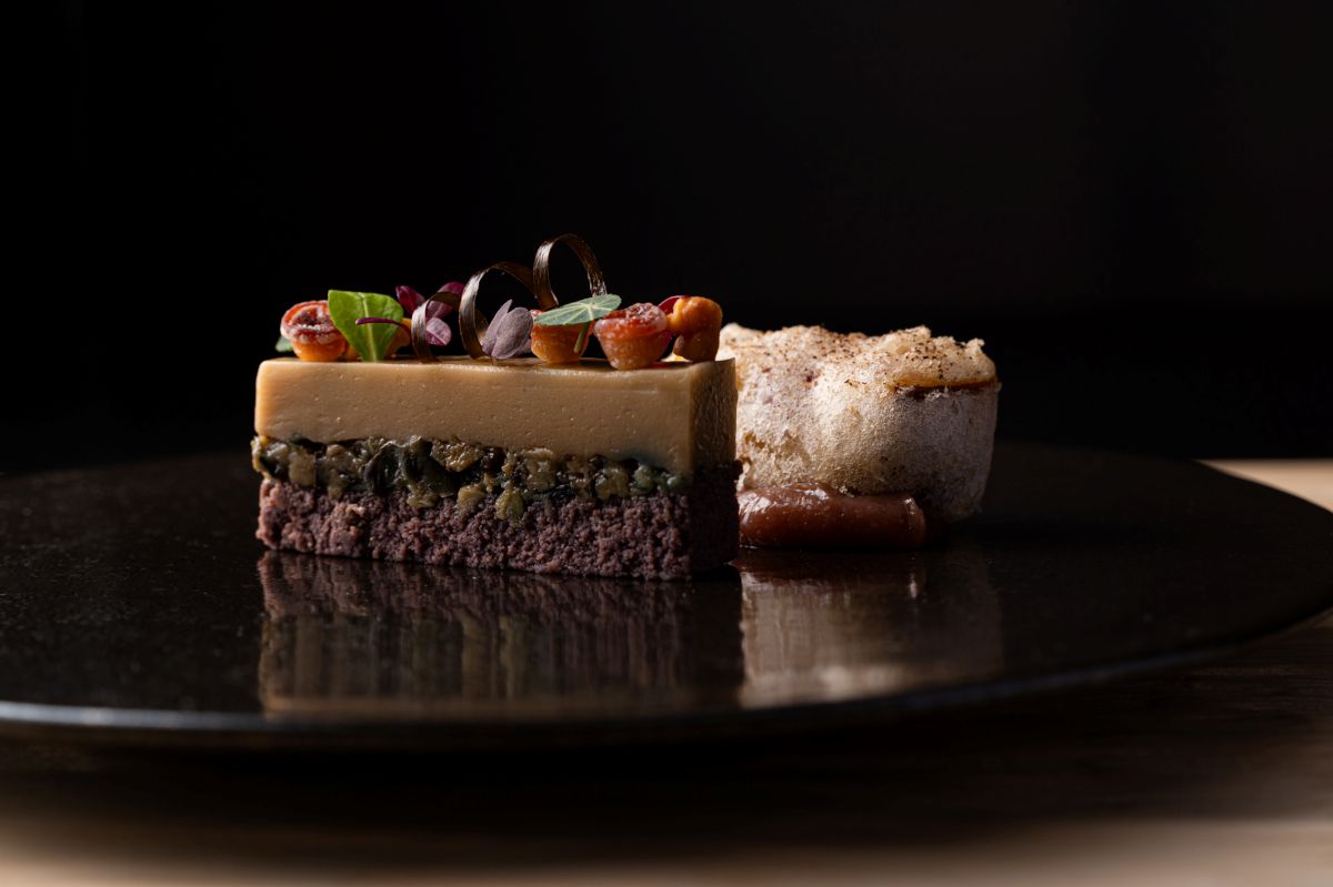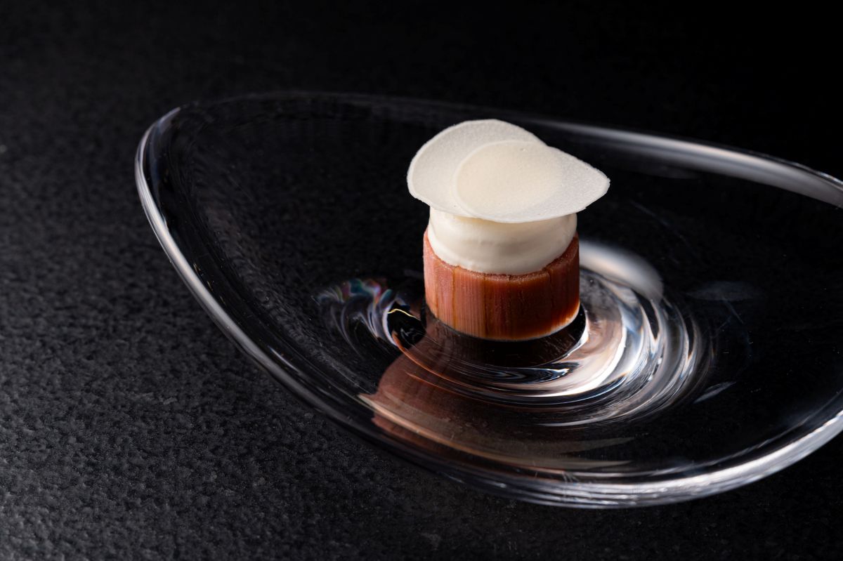 福井県の漬物である「赤ずいき」を使った「すこ」から着想を得たというデザートは、酸味と発酵のニュアンスをルバーブとヨーグルトで表現。