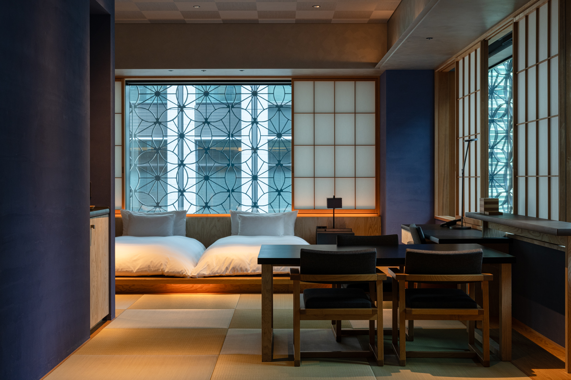 障子や麻の葉くずしの格子、畳など伝統様式が施された客室。
