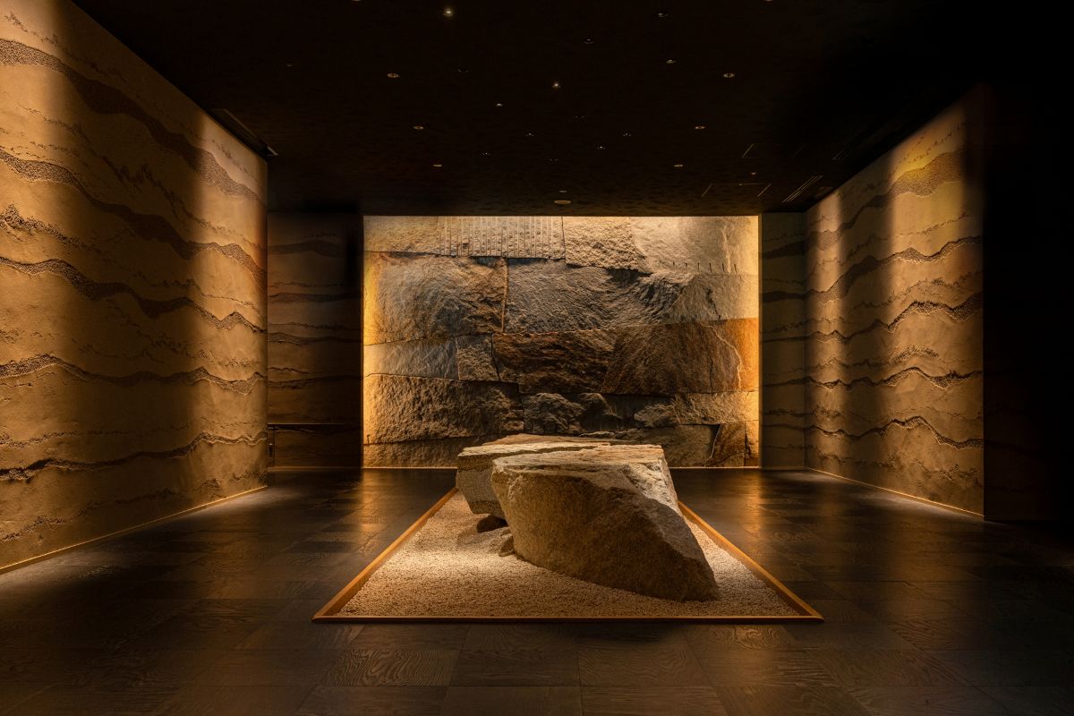 塔の日本旅館の地下1階にあるダイニングは、地層を意識した左官仕上げの壁と大きな岩がある静寂の空間が広がっています。
