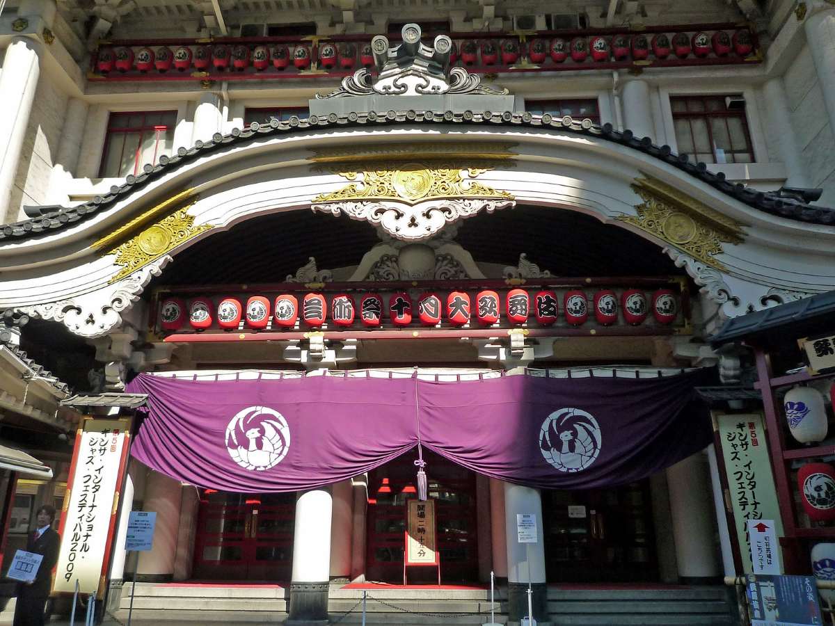惜しまれつつ2010年に閉場した、第3期の歌舞伎座に、勘亭流の懸垂幕がたなびく。