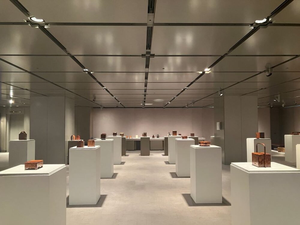 展示会場には、少し変わった趣の作品もある。指物は、板と板を接合していく工法のために、直線が主体の作品が多い。ところが、その作品はどちらかと言えば柔らかな曲線が主となり、全体的に丸みを帯びたフォルムで優しくたたずんでいる。