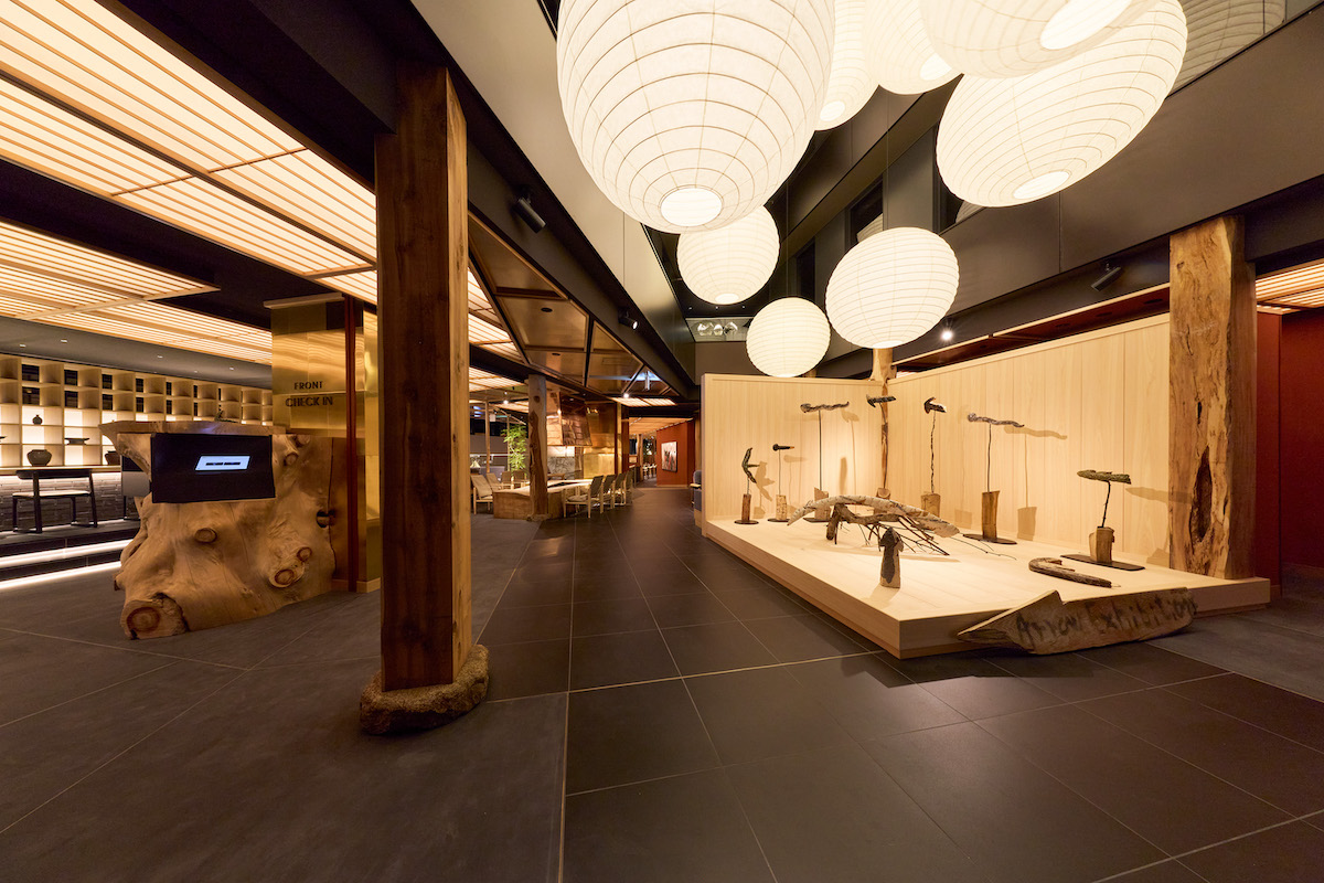 エントランスには、厳島神社の能舞台から発想を得たギャラリースペースが設けられ、書、水墨画、陶芸など、日本の伝統美を現代の感性で再構築したアートが展示されている。館内に広がる赤みを帯びた壁の色は、厳島神社の朱の鳥居をイメージしたものだという。