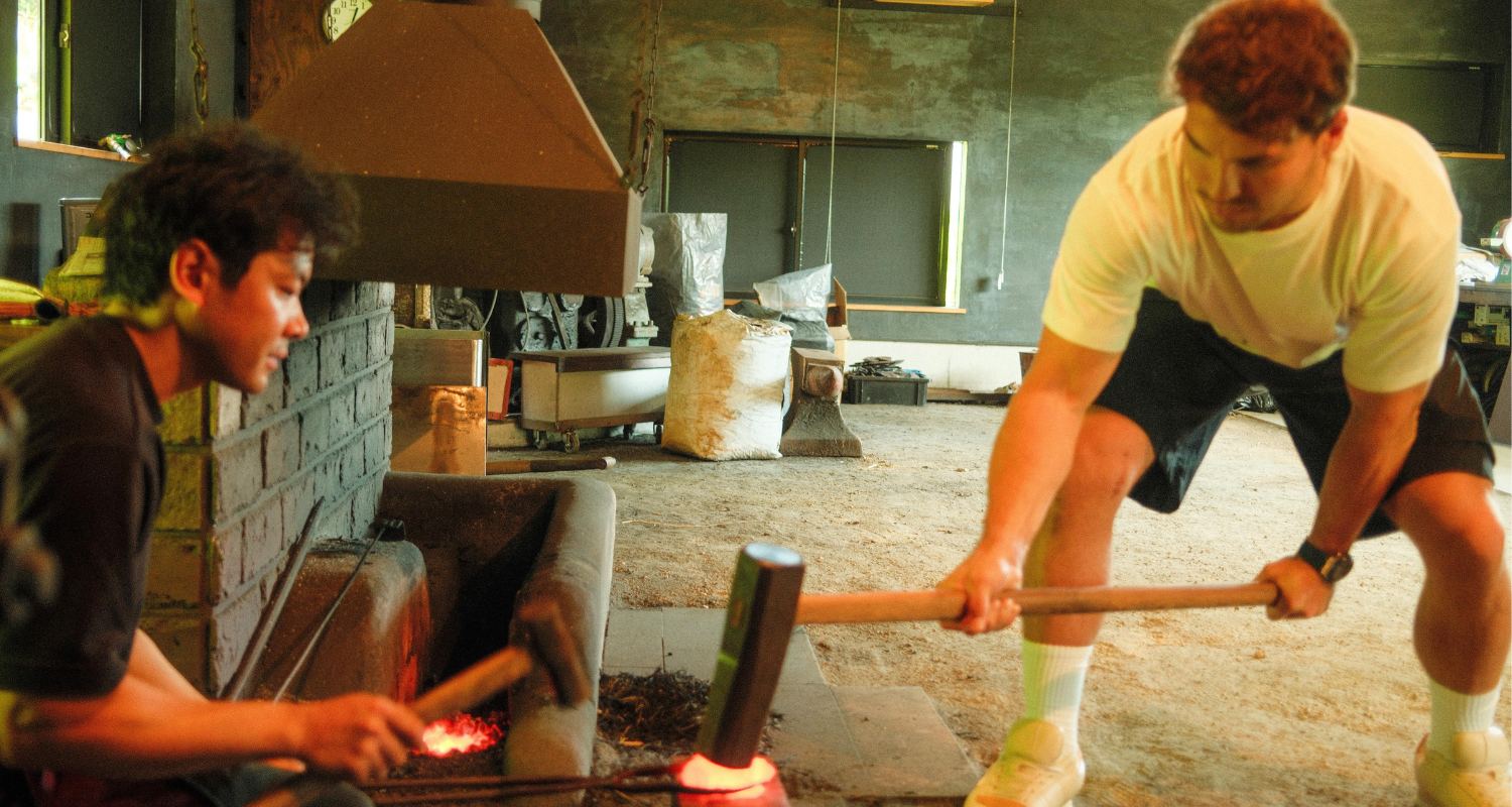 鍛錬は玉鋼を何度も叩いて折り返し、刀に最適な材料にする工程を要する。アントワーヌさんもトライ。
