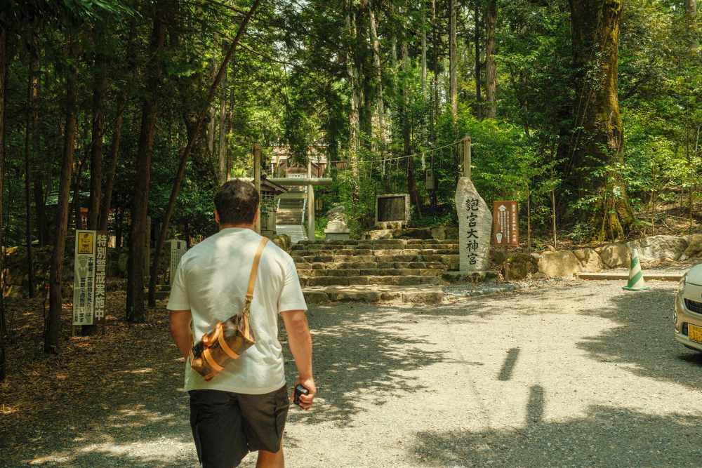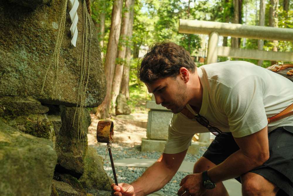 大阪から車で北上すること約2時間20分。まずは日本三景の一つである宮津湾に佇む天橋立を目指し、その奥にある眞名井神社に立ち寄った。元伊勢籠神社の奥宮で、辺りは清らかな気が漂うパワースポットとして信仰の篤い場所。アントワーヌさんは、説明を受けながら神妙な面持ち。御神水の「天の眞名井の水」で浸す「水みくじ」にも挑戦し、神秘的な体験を全身で享受しているように見受けられた。