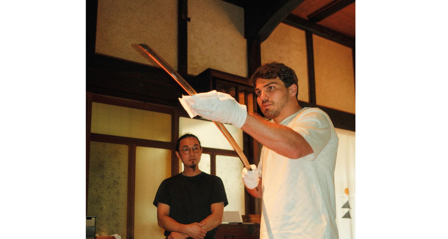 鋭く洗練されたフォルムと研ぎ澄まされた輝き、唯一無二の優美な刃紋。現代において日本刀が作られるのは、武器としてではなく、美術品、文化財、精神文化の象徴としての価値を継承・発展させるためという刀鍛冶の説明を受けながら、アントワーヌさんはまるで試合をするときのような鋭い眼差しで刀に対峙する。