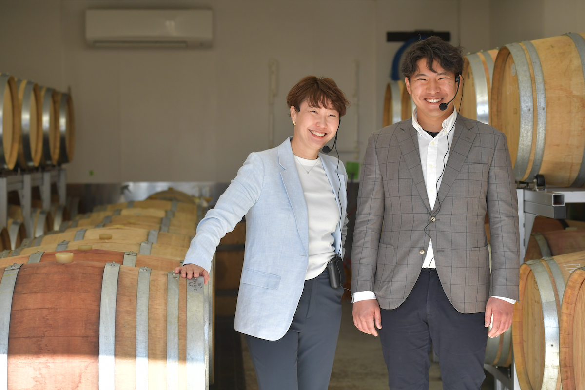 雨降りの2020年に初めて手がけたKisvin Zinfandel Roséを解説する川上さんと、その姿を袖から見守る斎藤さん。この日、川上さんの醸造責任者昇格が発表された。