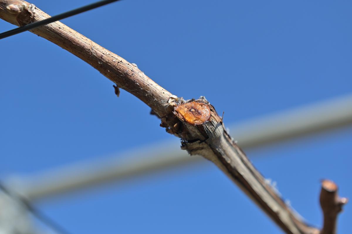 3月になって眠りから覚めたブドウの樹が土中の水を吸い上げる。剪定を終えた枝の先から“ブドウの涙”がこぼれ落ちる。