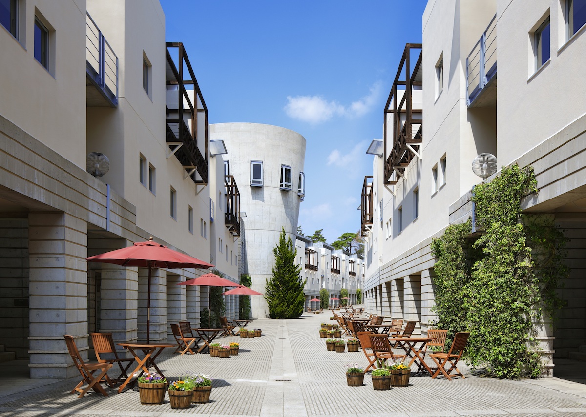 世界的建築家のマリオ・ベリーニが設計したリゾナーレ八ヶ岳。イタリアの山岳都市をイメージしたとされる。これは象徴的なピーマン通り。