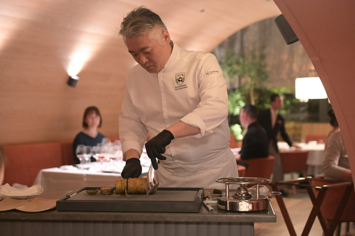 肉料理を自ら切り分ける鎌田匡人シェフ。