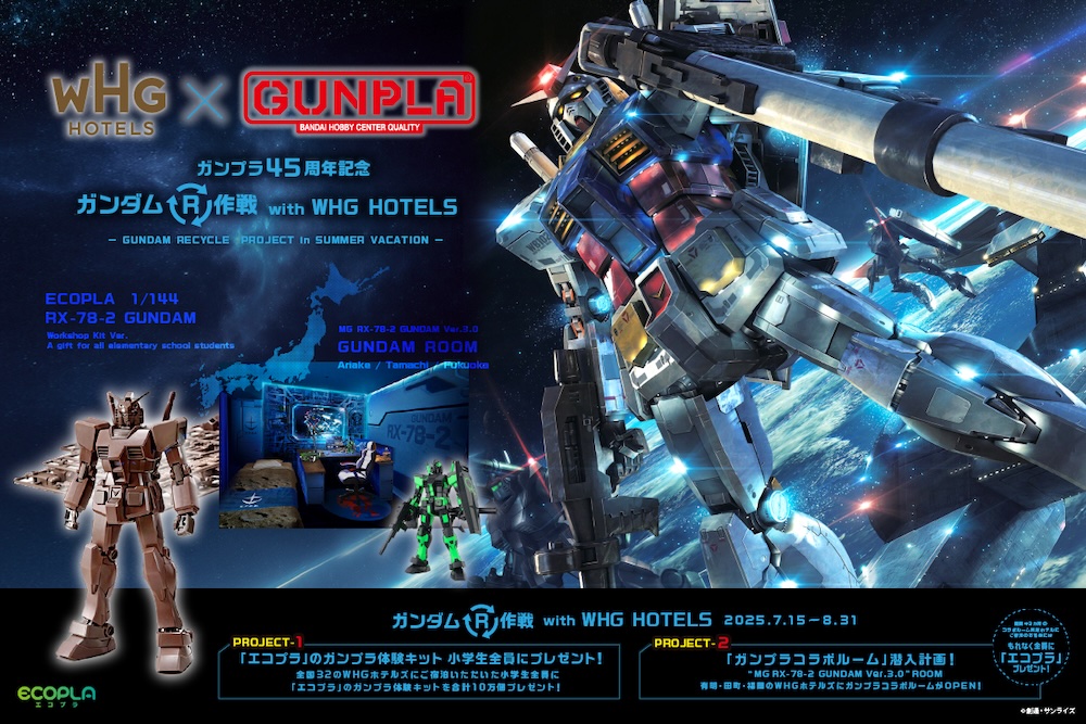 本次合作,將向全國參與飯店住宿的小學生贈送共10萬套由再生材料製成的「Ecopla」高達模型體驗套裝。套裝的魅力在於無需工具即可組裝,即使是第一次接觸塑膠模型的小朋友也能安心體驗「製作的樂趣」。此外,每家飯店都將設置回收箱,用於回收使用過的滑軌,讓孩子們在享受製作樂趣的同時,也培養環保意識。